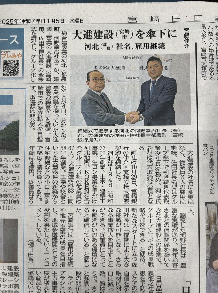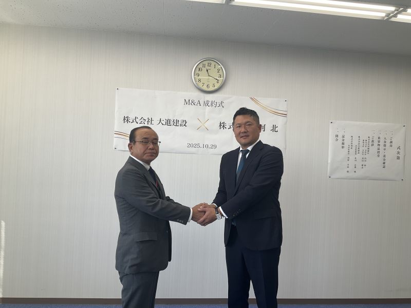 株式会社大進建設のグループ会社化に関するお知らせ 平素より格別のご高配を賜り、厚く御礼申し上げます。 この度、当社は株式会社大進建設との間でM&A成約式を執り行い、株式会社大進建設が当社のグループ会社となりましたことをお知らせいたします。 今回のグループ会社化により、両社の強みを活かし、さらなる事業の発展と施工品質の向上に努めてまいります。今後とも変わらぬご支援を賜りますよう、お願い申し上げます。